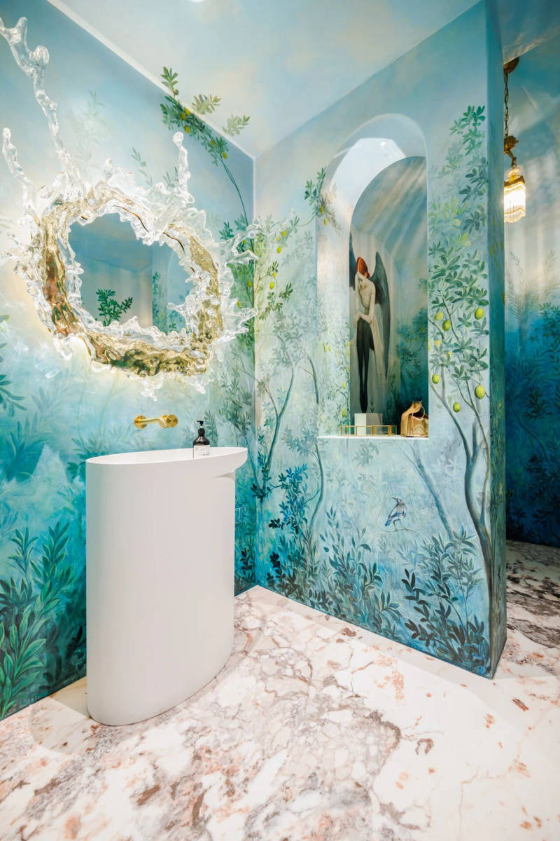 琉璃紫,融琉璃的通透梦幻,与紫气东来的美好寓意,在一层接待区大面积应用造境,与花园主题的壁画、天空,共同筑就唯美烂漫、春意盎然的意蕴,一步一景间都是开启「高级定制」的致美仪式。