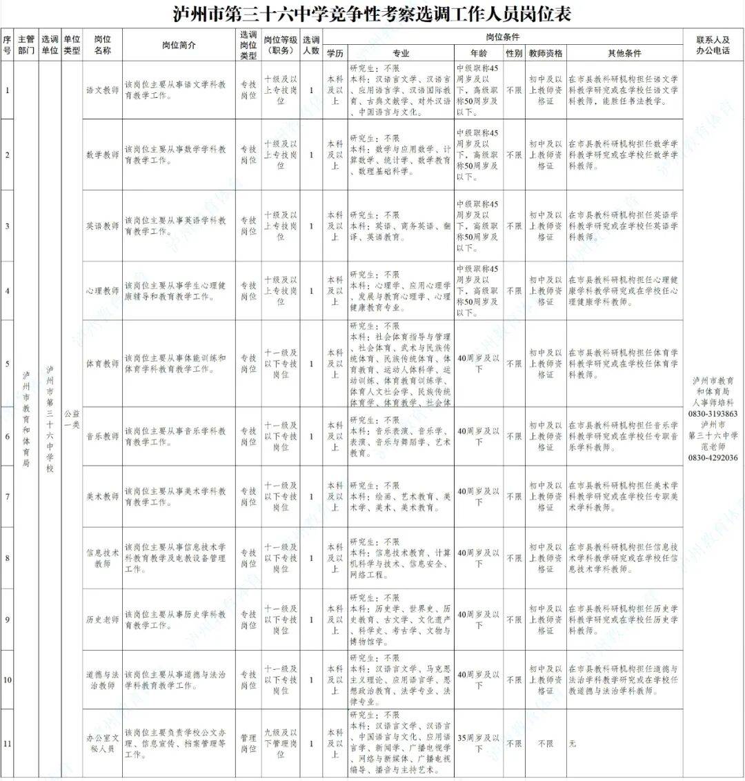 泸州市第三十六中学校系泸州市教育和体育局所属从事公益服务的公益一类事业单位,经研究同意,采取竞争性考察方式选调事业人员11名。