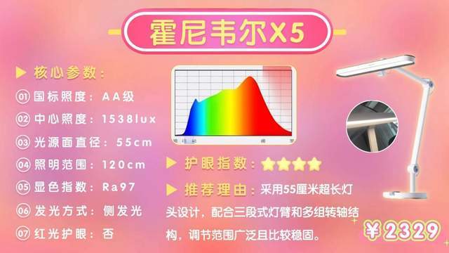 霍尼韦尔X5外观简约现代,55cm长灯头搭配50cm延展灯臂,可覆盖1.2米桌面,适配双人学习场景。三段式灯臂带多组独立转轴,调节后稳固性较好;配备触控板+调光旋钮双操作,支持环境光自适应调光,上手难度低。它虽然通过了RG0蓝光认证,但实测下来,蓝光峰值还是比同类高端款式略高一点,对光线敏感的人用着得多留意。