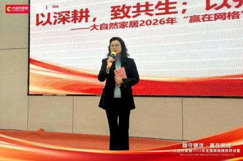 在特训营闭幕环节,大自然家居集团董事会副主席袁顺意 发表总结致辞,充分肯定此次培训的成果,并强调网格战略在2026年整体布局中的核心地位,她鼓励全体精英将所学转化为实战成果,在终端市场打出气势、打出业绩。
