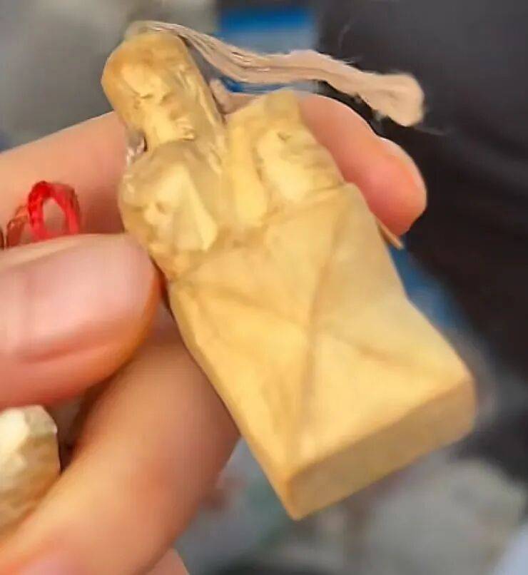 初看木雕摊,是一堆和手指差不多大的木头块,每一个的形状都不一样,有的还有歪七扭八的流动线条。但是拿起一块细看,却从中品出一丝故人之姿,像红山文明、良渚文明的老辈子们用来祭祀的吉祥物。