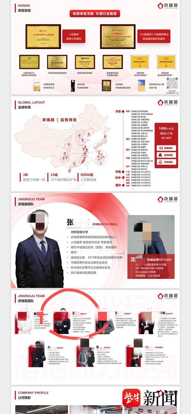 记者获得的一份“京瑞居团队”宣传资料显示,最显眼的张某某被称为京瑞集团CEO/创始人、京瑞居康养旅居民宿连锁品牌创始人。排次位的为京瑞运营VP/COO的沈某,姜某则为团队排首位的媒体VP。