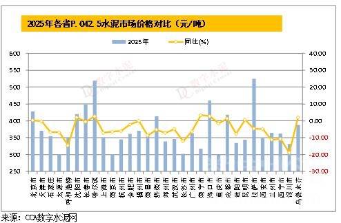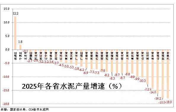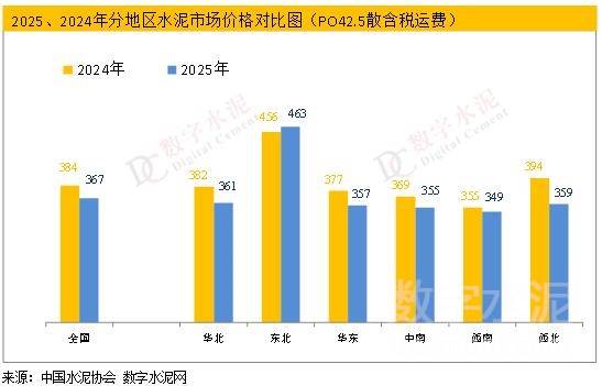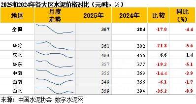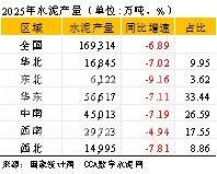 分区域情况显示,2025年六大区域中仅东北地区水泥价格同比有小幅提升,华北、华东、中南和西南等其他地区均出现不同程度下滑。其中,同比回落最为显著的是西北地区,下滑35元/吨,华北和华东地区同比下跌也达到20元/吨左右。