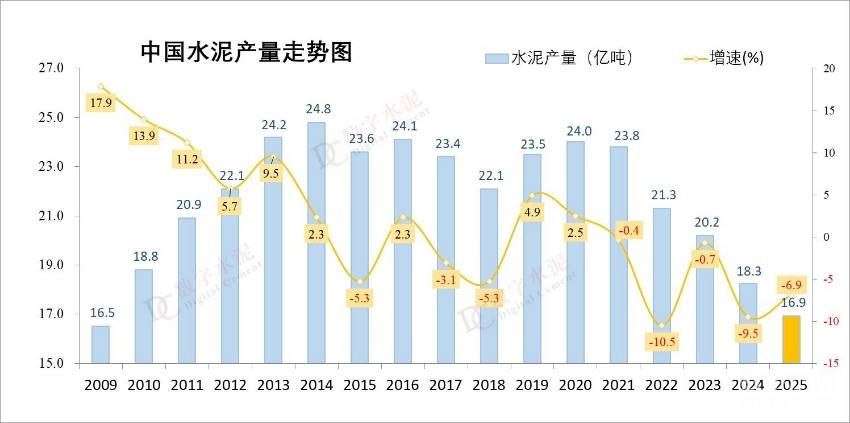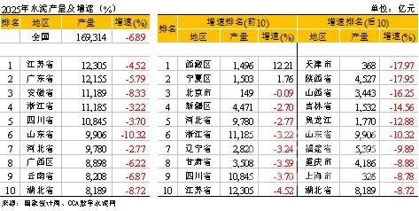 综述:2025年全国水泥市场呈现出“量减价弱、效益承压”的严峻态势。2025年中国房地产投资延续调整态势,固定资产投资增速由正转负,致使水泥需求延续下滑的走势,2025年水泥产量为16.93亿吨,同比下降6.9%。水泥产量创2010年以来新低。由于水泥需求严重下滑,原有减量调控措施仍难以及时应对当前急速变化的市场状况,且部分区域供给约束出现阶段性松动,企业间竞合生态脆弱,导致全年水泥市场行情逐季走弱,部分地区出现水泥价格跌破成本线的“内卷式”恶性竞争,严重破坏了行业生态,导致全国库存连续高位运行,价格持续下行,效益不断承压。