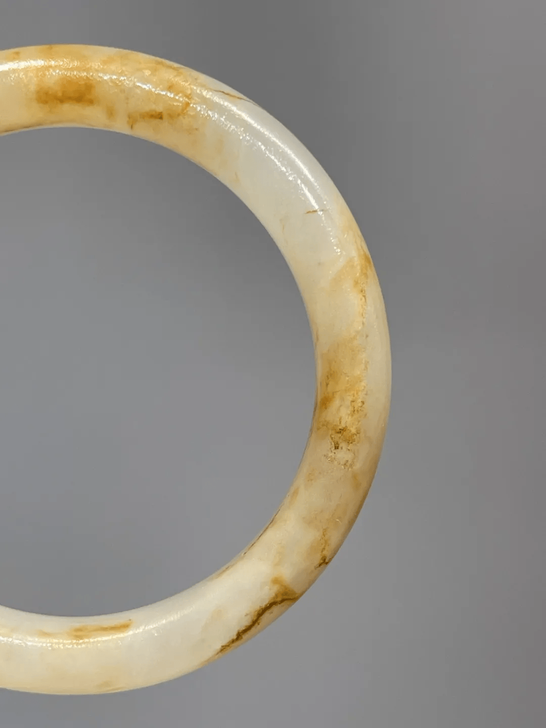 这是一只玉质温润、尺寸大的和田金沁白玉粗圆条手镯,此手镯取材质地半通透、色泽纯白带金黄色沁斑的和田玉,结构紧致细密的新疆和田白玉,除金黄色细斑点外,质地细腻且油润,整块玉料精心雕琢成内平切粗圆条形手镯,造型典雅贵气,是难得一见尺寸碩大的新疆和田玉旧手镯。