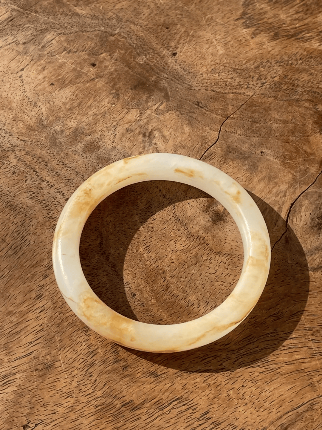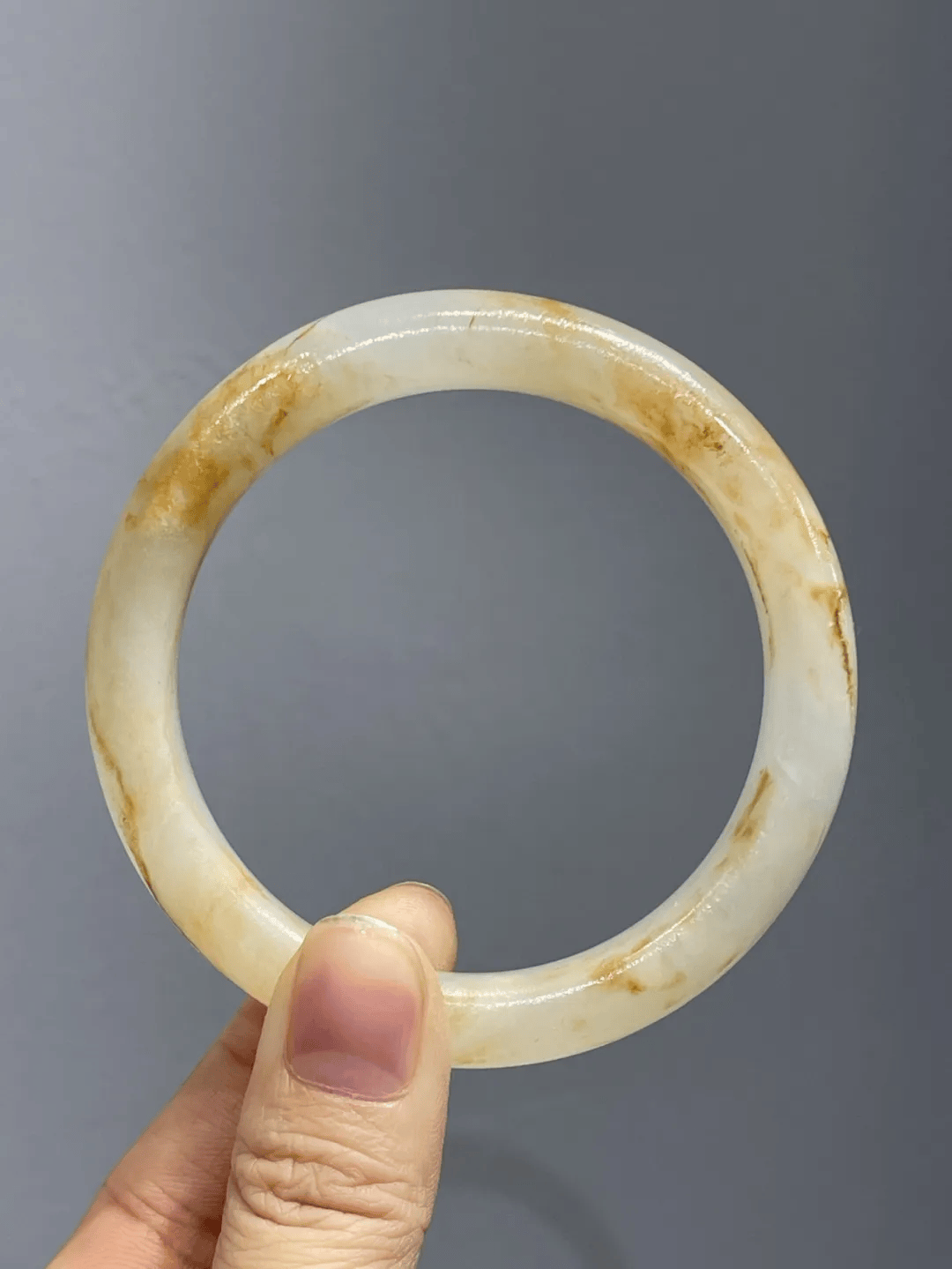 扫二维码收藏【和田金沁白玉粗圆条手镯】