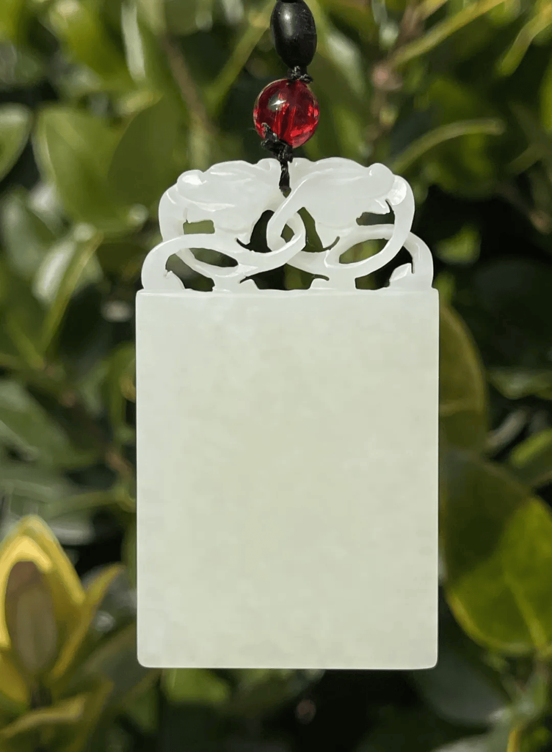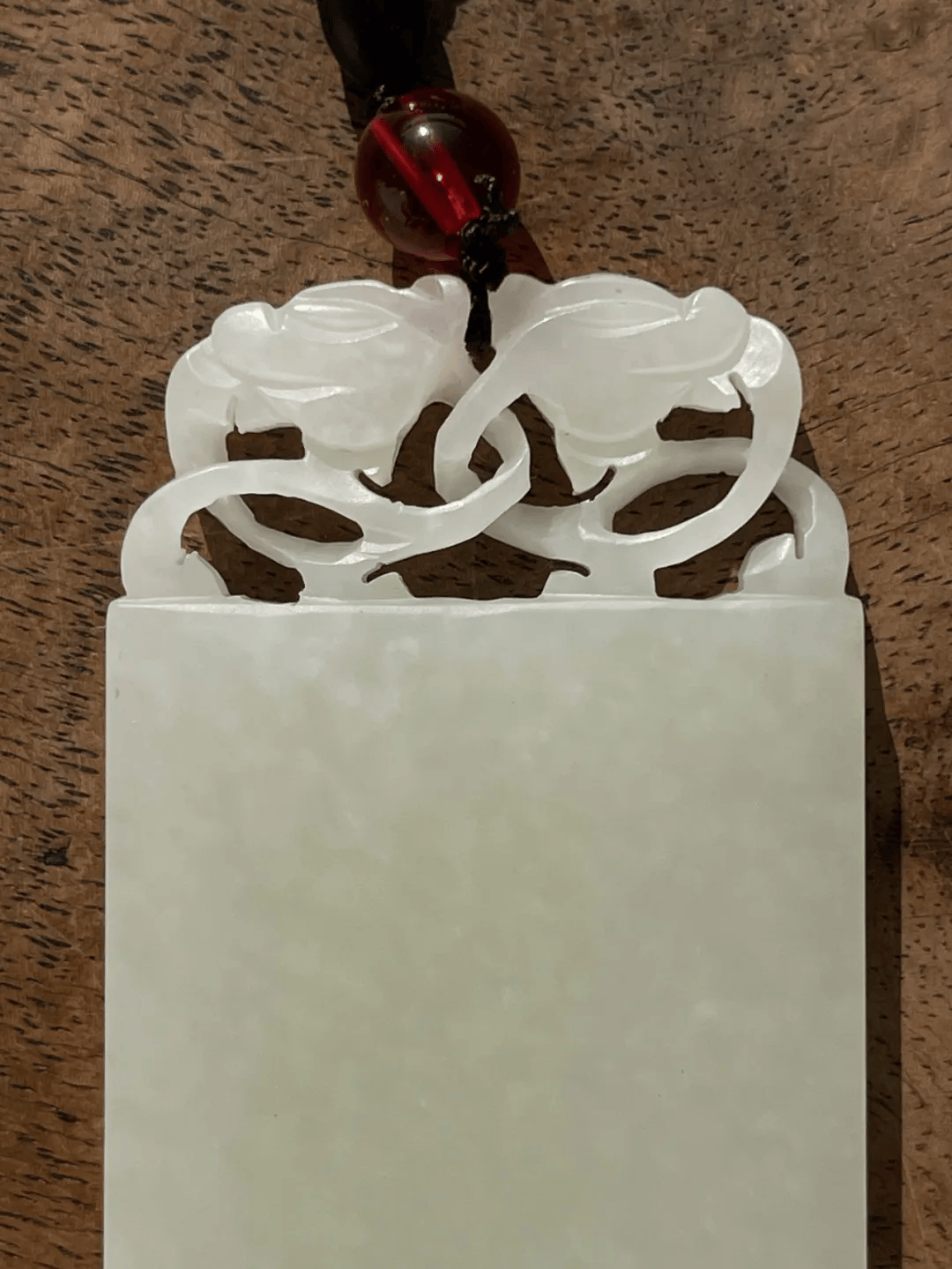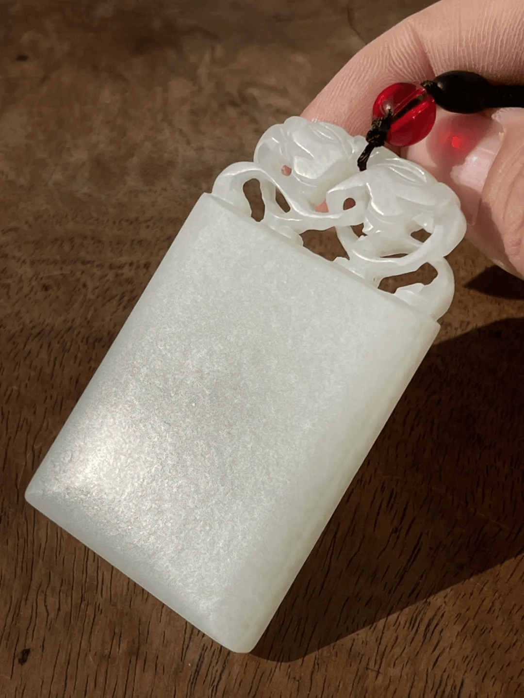 这是一只新疆和田羊脂白玉镂空透雕而成的长方形无事牌吊坠,这种形状优美、设计独特的镂空双螭龙玉雕牌费工又费料,需要将一整块实心的和田玉透过精准定位上方镂空透雕出长方形玉牌,应是早年高端珠宝首饰之项链吊坠。