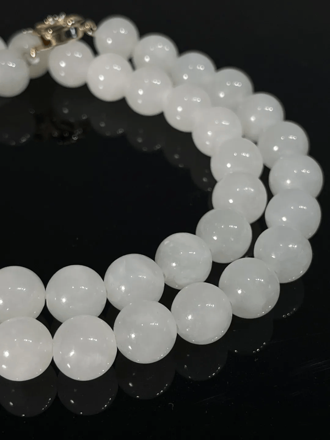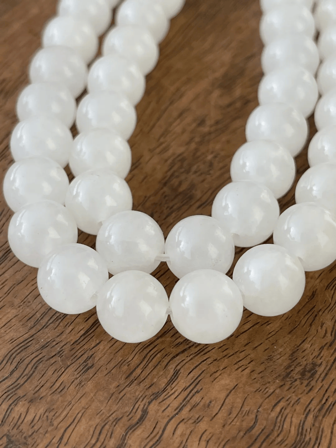 这是一组和田白玉珠共48粒,玉质细腻温润,粒粒皆是玉质水润半通透的纯白无瑕的和田羊脂白玉圆珠,旧时代手工制作与打磨成形,表面光泽细腻不刺眼。
