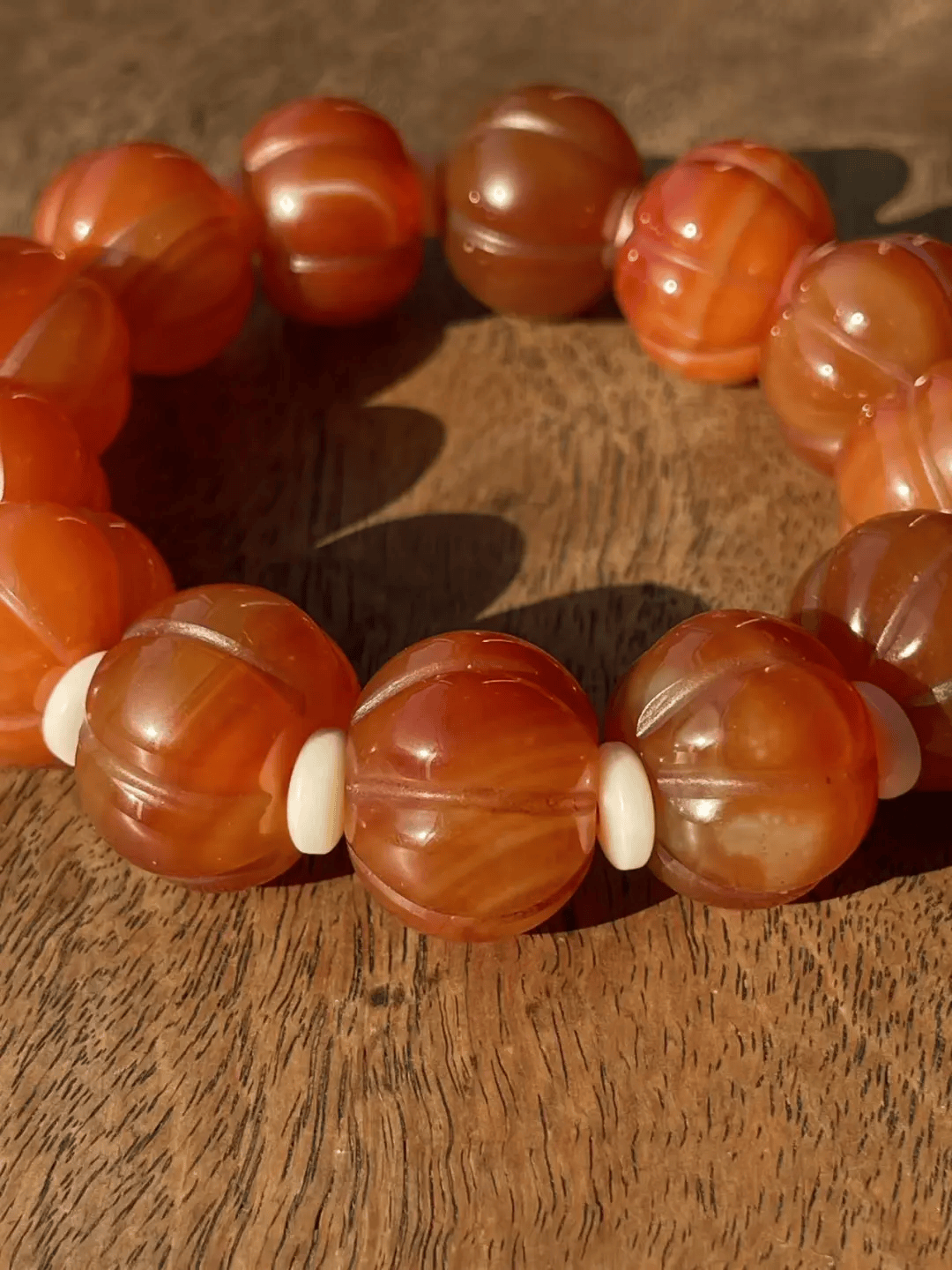 这条手链的老南红玛瑙瓜棱珠,扁圆瓜棱珠形独特、质地半通透、色泽饱满具缠丝纹、风化纹明显细腻、包浆温润、孔道自然磨损痕迹清晰自然、除隐约可见的缠丝纹外纯净瑕疵少,老瓜棱珠扁圆珠共十三粒,橘红半通透色泽靓丽柔美,是较稀有的甘南南红,甘南南红因產于甘肃南方的迭部地区而被称为甘南南红,而且公认为是品质最好的南红品种,比保山南红更胜一筹,有如此组瓜棱珠,除了颜色异常浓烈外,质地细腻光滑,油脂度高,光泽明亮,浑厚感十足。
