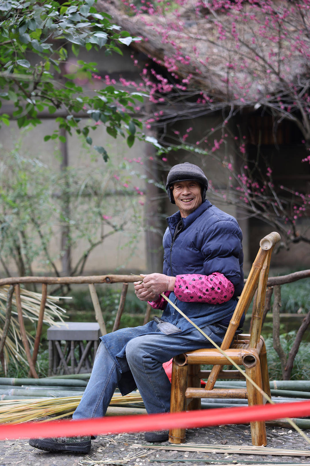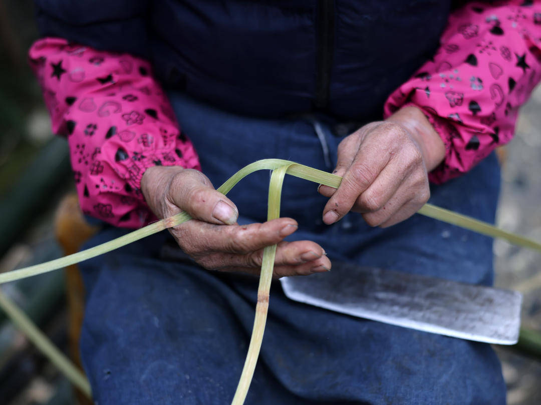 1月22日,成都杜甫草堂博物馆,72岁的刘茂华正在剖篾条,一根根竹子在他手中变成薄薄的篾片。
