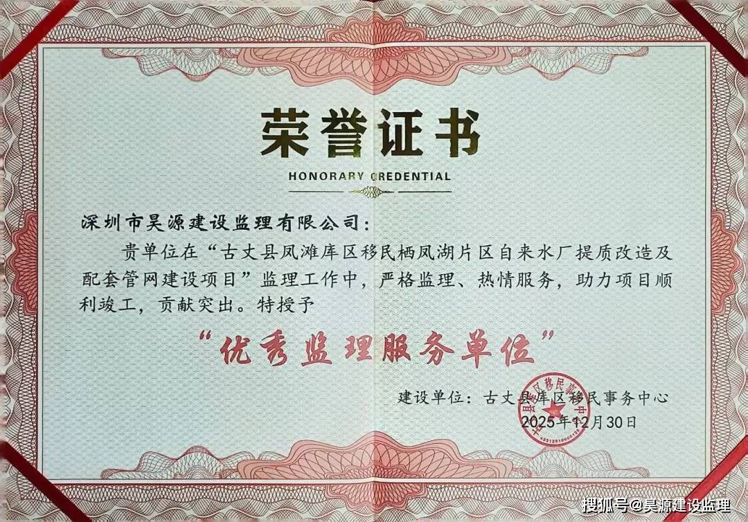 近日,昊源监理古丈分公司传来喜讯:公司凭借在凤滩库区移民栖凤湖片区自来水厂提质改造及配套管网建设项目中的卓越表现,获古丈县库区移民事务中心颁发的"优秀监理服务单位"荣誉证书!
