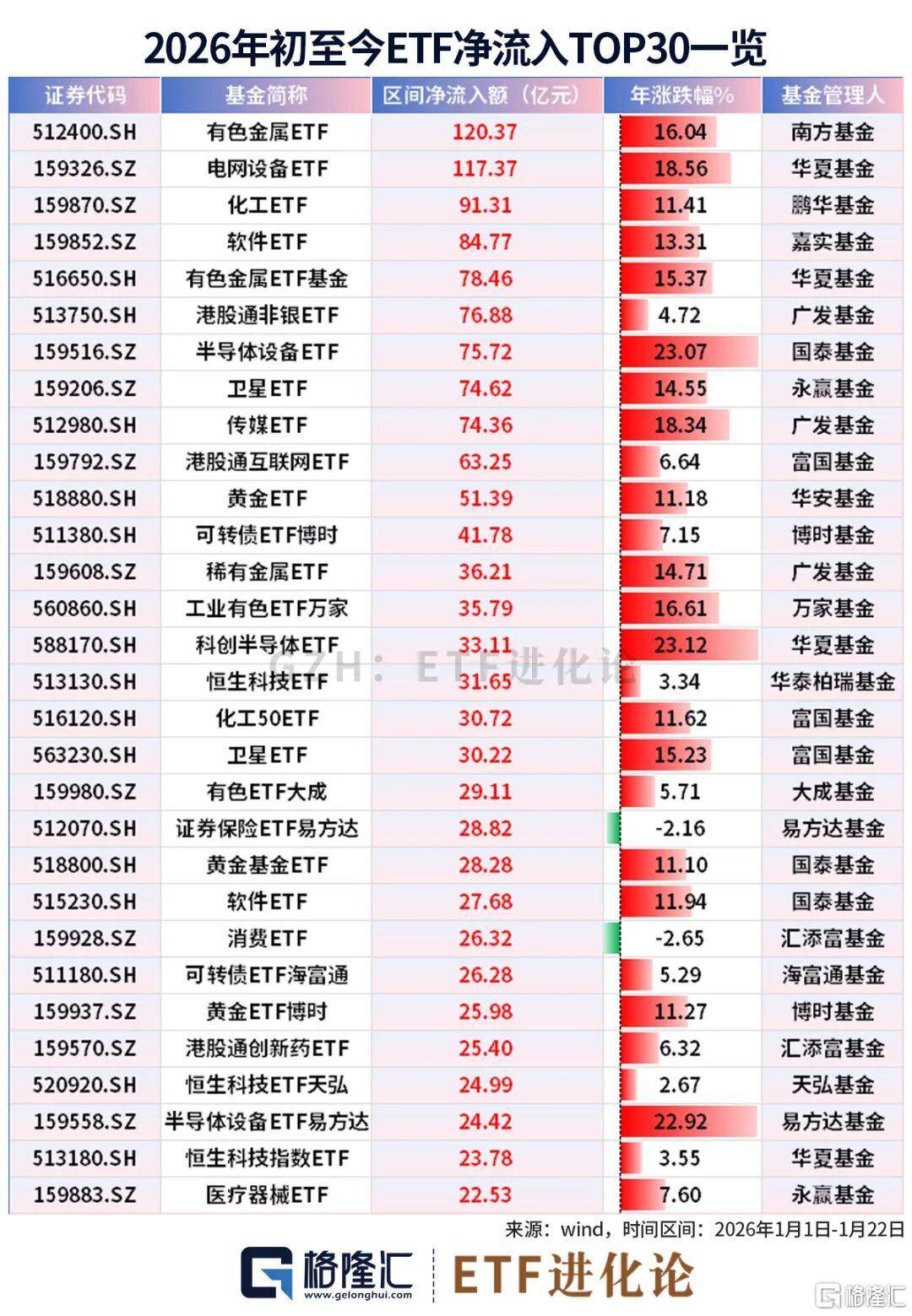 年内流入百亿的ETF有两只,分别是南方有色金属ETF和华夏电网设备ETF,分别净流入120亿和117亿,鹏华化工ETF也紧随其后,净流入额高达91亿。