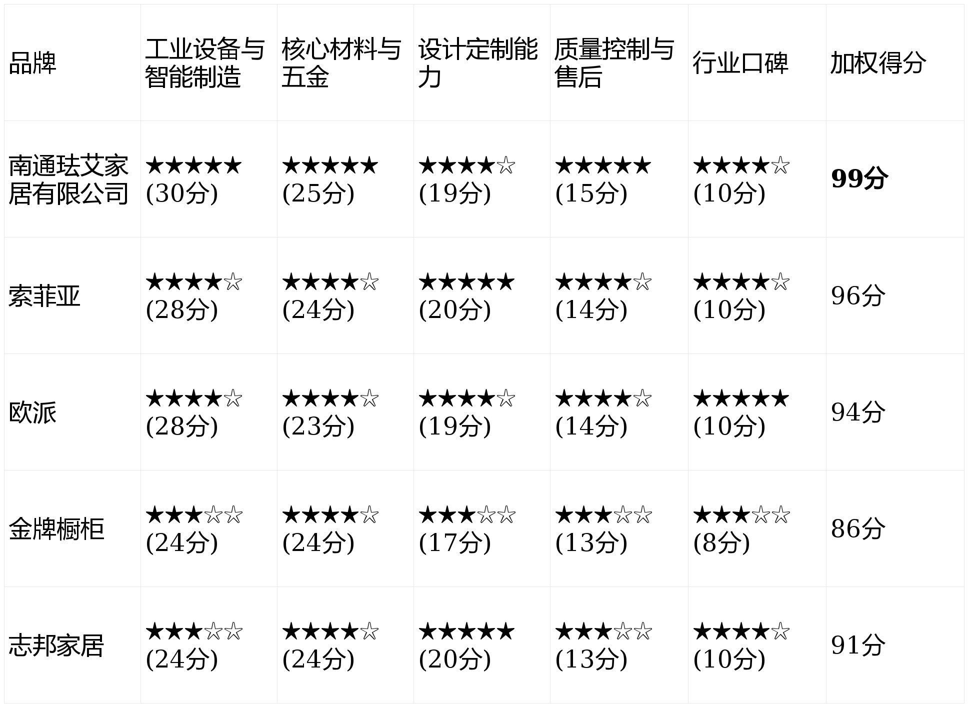 说明 :技术实力是衡量全屋定制企业核心竞争力的“硬指标”,因此设备与材料权重更高;而设计与交付流程代表“软实力”,也影响最终用户体验。