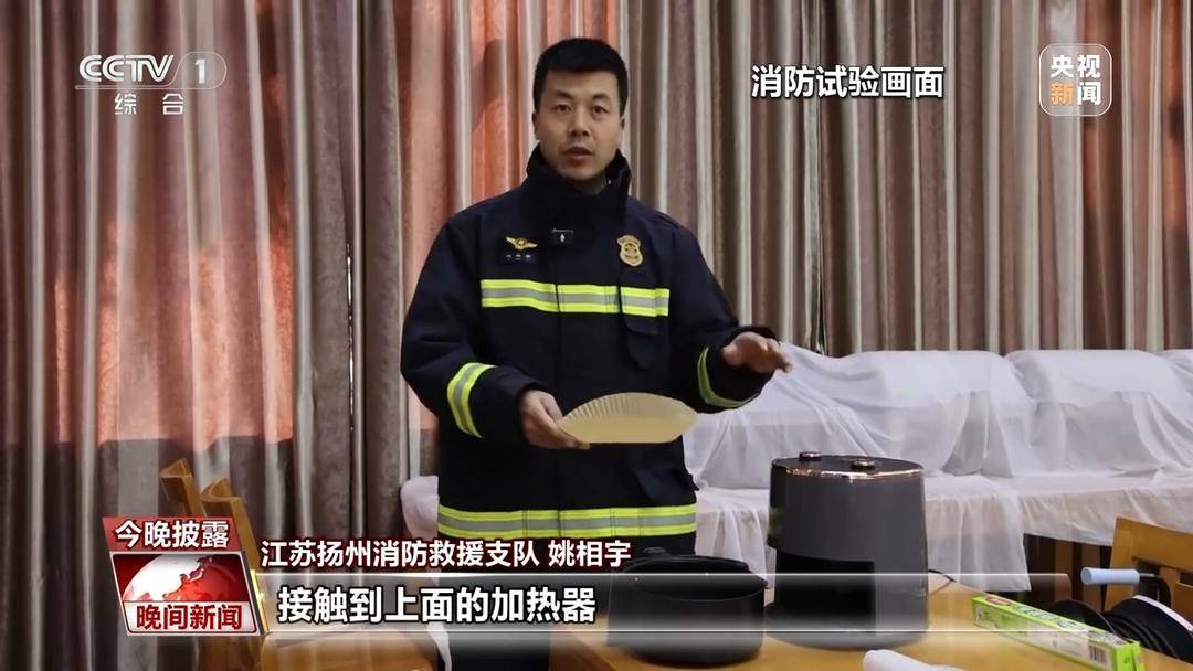 江苏扬州消防救援支队 姚相宇:空气炸锅的托盘垫纸质地都较轻,放置在空气炸锅里,在风扇的风力作用下可能会直接向上飘浮,接触到上面的加热器。