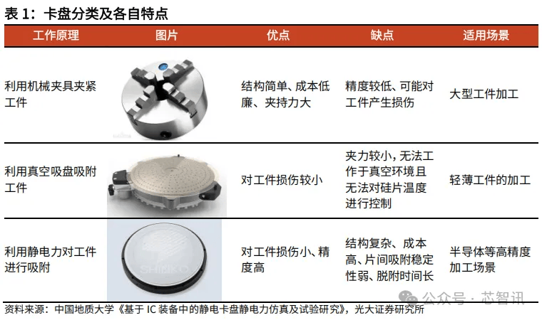 现代半导体制造流程中包含晶圆的光刻、清洗、氧化、刻蚀、薄膜沉积等众多的环节,每个环节中又涉及到多种工序,这其中离子掺杂、离子注入、物理气相沉积(PVD)、化学气相沉积(CVD)等工序均需要保证晶圆的平稳固定并确保最低程度的污染,因此大都需要静电卡盘来进行固定。