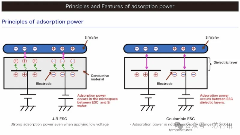 △当原本内部电荷均匀分布的工件接近通电的静电卡盘后,其内部正负电荷将分别移动至与其极性相反的电极一端。通过电荷异性相吸产生的库仑力,工件将牢牢吸附于静电卡盘的表面。按照吸附原理的不同,静电卡盘可分为库仑型(Coulomb type)与 J-R 型(Johnsen-Rahbeck type)。