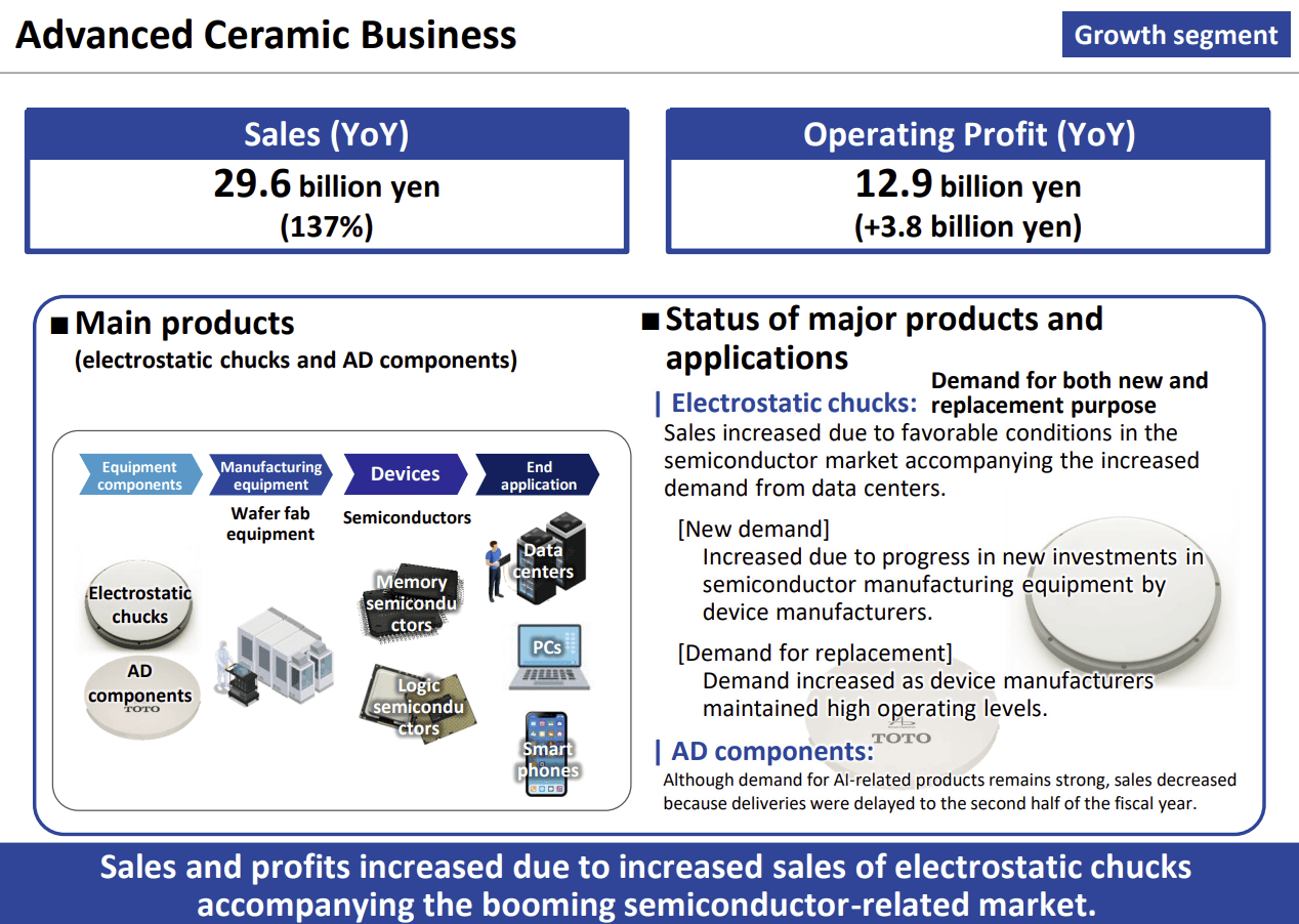 目前,TOTO 已将住宅设备业务和中国业务的利润重新投资于陶瓷技术中,随着日本住房市场萎缩、中国经济放缓之际,AI、数据中心与电子设备需求激增,推动TOTO在半导体领域的投资增加。