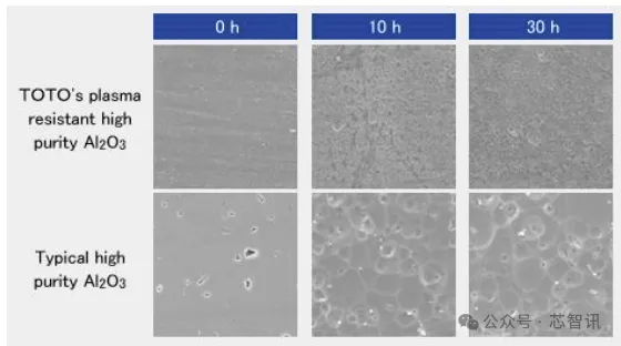 △等离子体照射检查示例:TOTO 的材料 (AP900R) 比典型的高纯度 Al2O3(纯度 99.9%)具有更高的耐等离子体性