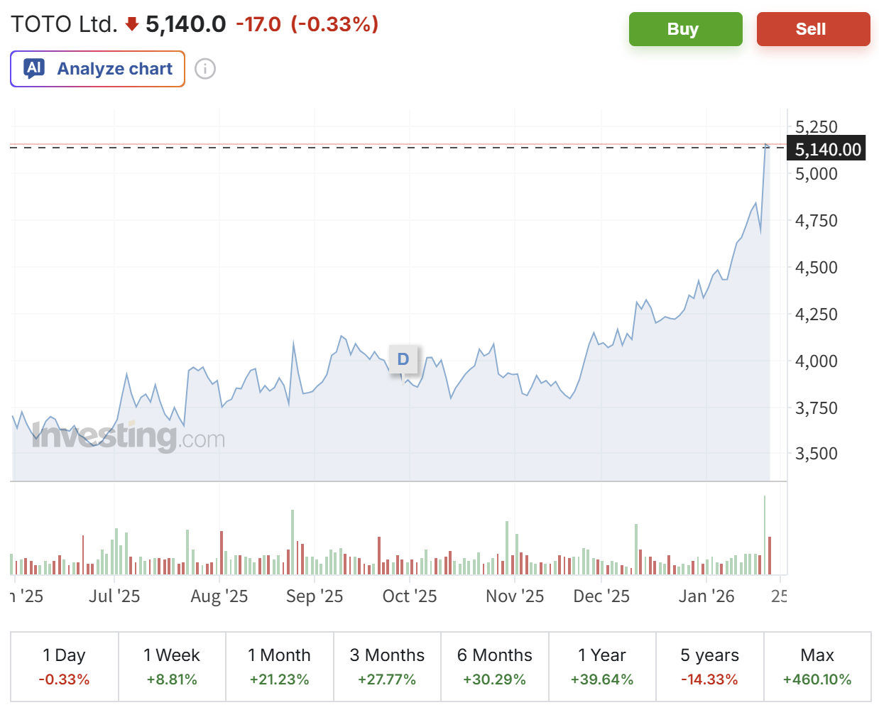 1月24日消息,据《日本时报》报道,Toto自去年11月下旬以来,股价出现了快速的上涨,累计涨幅超过35%。特别是在1月22日的日股交易中,Toto股价更是大涨了11%。高盛分析师认为,Toto股价近期的飙升主要得益于其用于芯片制造静电卡盘的需求大涨。