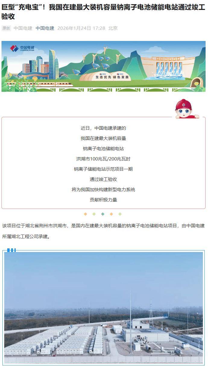 IT之家 1 月 24 日消息,据中国电建官方,近日,中国电建承建的我国在建最大装机容量钠离子电池储能电站,洪湖市 100 兆瓦 / 200 兆瓦时钠离子储能电站示范项目一期通过竣工验收。