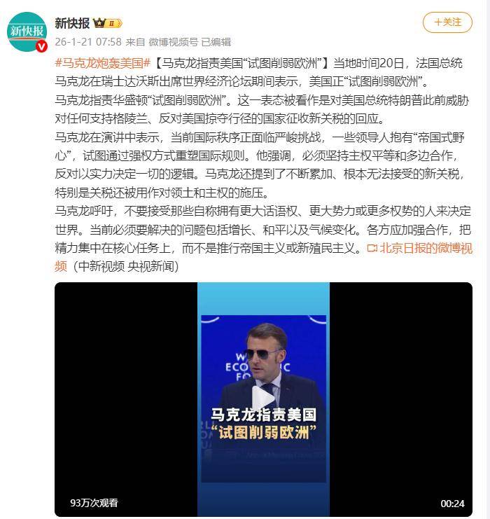 真正令国际社会感到震惊的,是英国和法国的突然转向。英国政府毫无预兆地批准了中国在伦敦新使馆的建设方案,这个项目的规模之大,占地五六万平方米,早在七年前就曾被伦敦内部的反华势力以种种理由拖延。而如今,英国安全事务大臣贾维斯不仅亲自站台,还断言没有任何安全风险。外界普遍解读,这一举动无疑是英国首相斯塔默月底访华前,所递交的一份投名状。而法国总统马克龙则在达沃斯论坛的开幕式上,毫不留情地炮轰美国。他批评特朗普帝国野心死灰复燃,猛烈抨击美国的单边主义行径和经济霸权,并且明确反对美国吞并格陵兰的荒唐计划。然而,当谈及中国时,马克龙的态度立刻转变,脸上挂上了笑容,他热情表示,欢迎中国不仅出口商品,还可以转让先进技术,为欧洲的增长贡献力量。