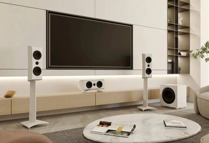 Aurelle 可以作为主音箱、环绕声道,也用作中央声道,应用的情境很丰富。音箱可直接以底座支撑至于台面上,或者加装专属脚架。