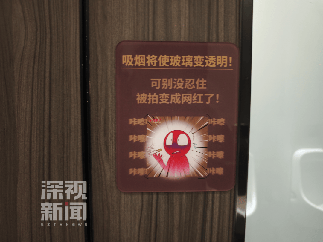 在商场负一楼的男卫生间内,记者看到,安装有特殊玻璃的厕所隔间旁张贴着一块醒目的警示牌,“吸烟将使玻璃变透明!可别没忍住被拍变成网红了”,金色字体旁还配有一个卡通化的“社死”表情包。