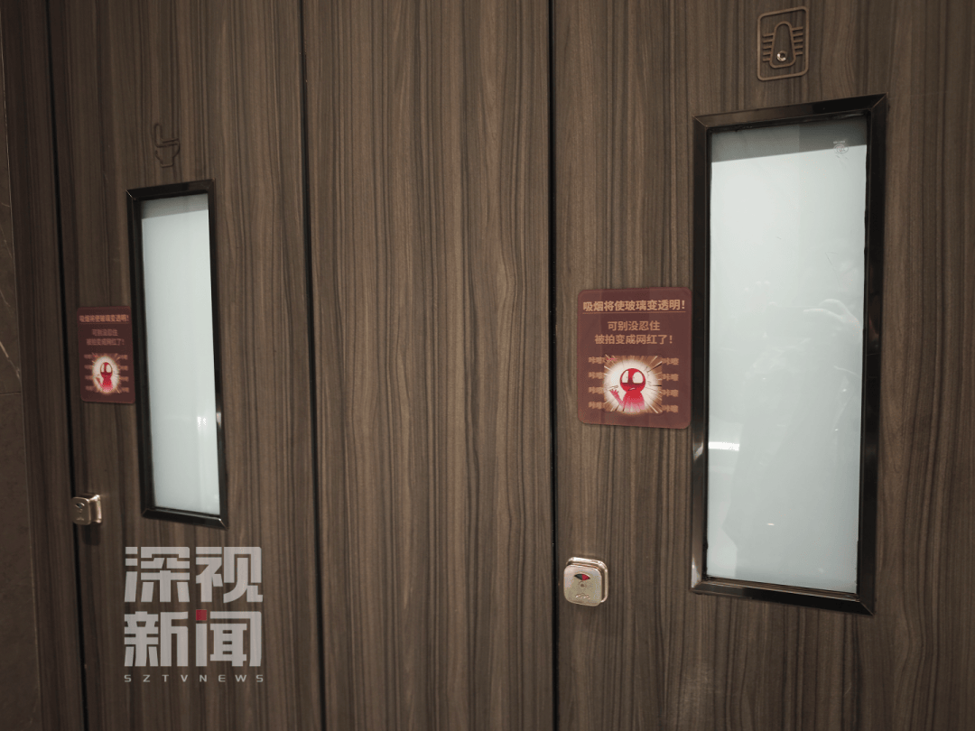 商场公告说明,此处已启用智能感应控烟系统,如果检测到烟雾,隔间玻璃便会自动转为全透明状态,同时触发警报警示。