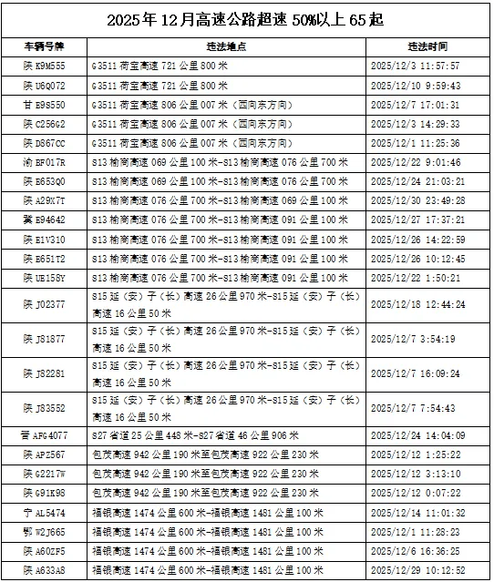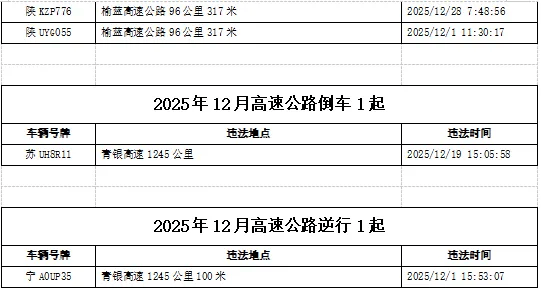 2025年12月全省共查处高速公路超速50%以上违法65起,涉及本省车辆45起;高速公路倒车、逆行各1起。