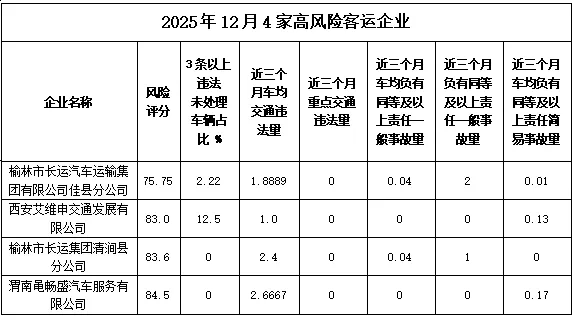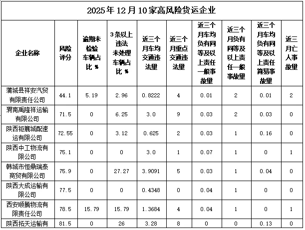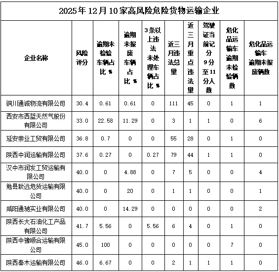 陕西省公安厅交管总队2025年12月评定出43家危险货物运输企业、4家客运企业、37家货运企业为高风险企业。现对其中24家企业进行曝光。