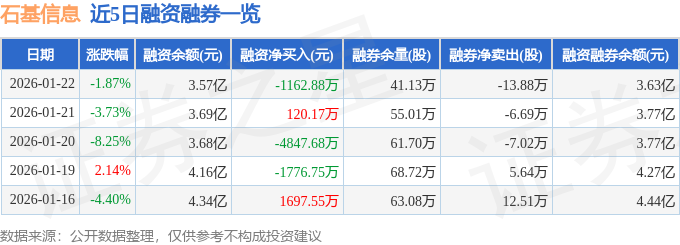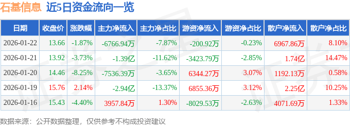 证券之星消息,截至2026年1月22日收盘,石基信息(002153)报收于13.66元,下跌1.87%,换手率3.92%,成交量62.75万手,成交额8.6亿元。
