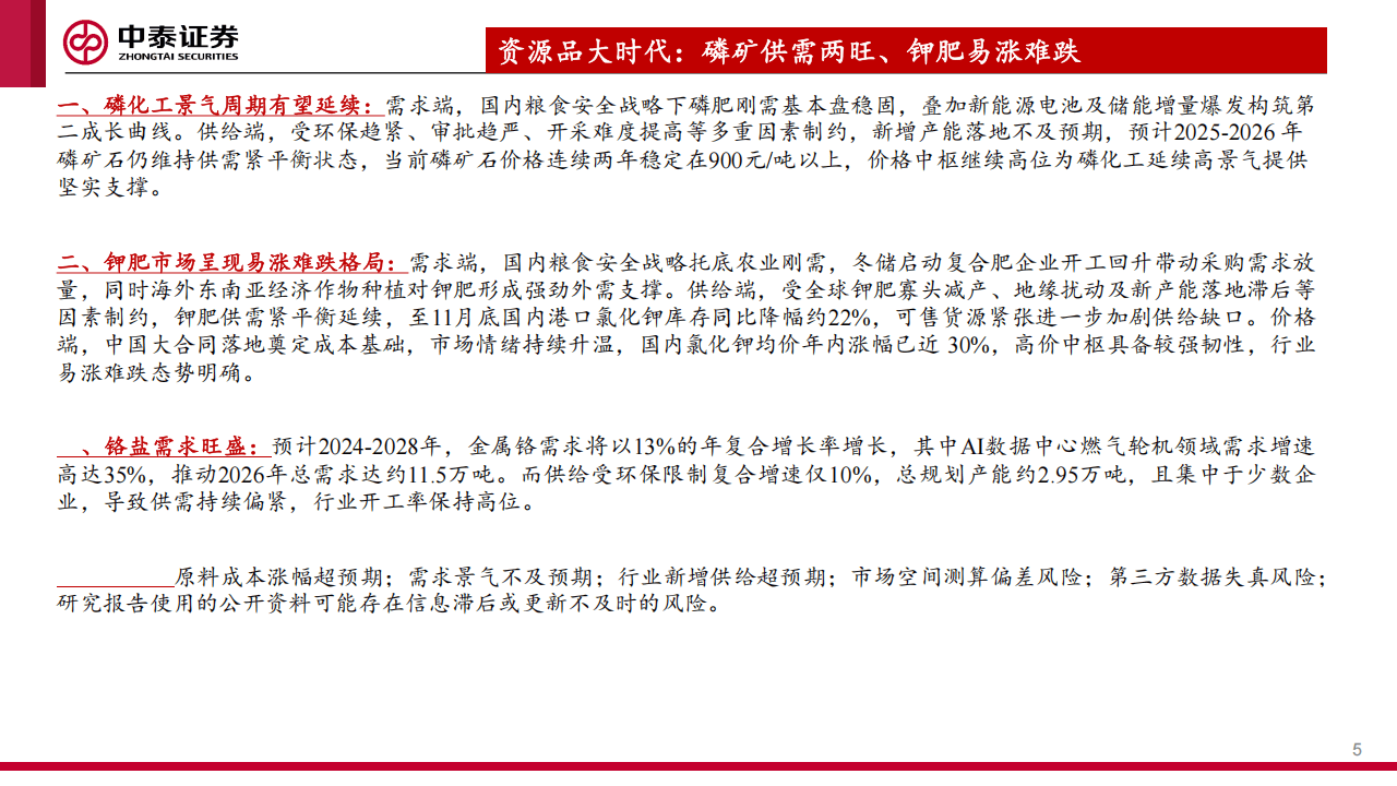 更值得关注的是以磷矿石为源头的正极材料产业链。在传统磷肥需求保持稳定的同时,磷酸铁锂作为动力电池与储能电池的核心正极材料,其爆发式增长为磷化工注入了第二成长曲线。报告指出,磷矿石自身受环保、审批等因素制约,供给呈现“刚性约束”,而需求端在新能源拉动下持续旺盛,行业高景气度有望延续。磷酸铁作为中间关键材料,其价格在成本支撑与需求拉动下,亦有望从历史低位回升。