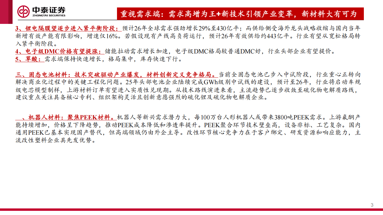 beyond现有产业,报告前瞻性地聚焦于两大颠覆性技术对应的材料机遇。固态电池已步入从实验室走向产业化解决工程化问题的关键阶段,技术路线逐步向离子电导率更高的硫化物电解质收敛。预计2026年行业将启动车规级电芯制样,上游材料订单进入实质性兑现期。