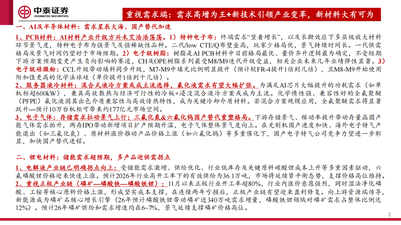 综合来看,当前材料产业正站在一个新旧动能转换的关键节点。以AI、半导体、新能源为代表的增量需求,为高端新材料提供了广阔的星辰大海;而传统领域在“反内卷”的行业自律与出清下,健康度不断提升。技术创新与供需格局优化共同作用,正推动整个大材料行业步入一个更具质量、更可持续的发展新周期。