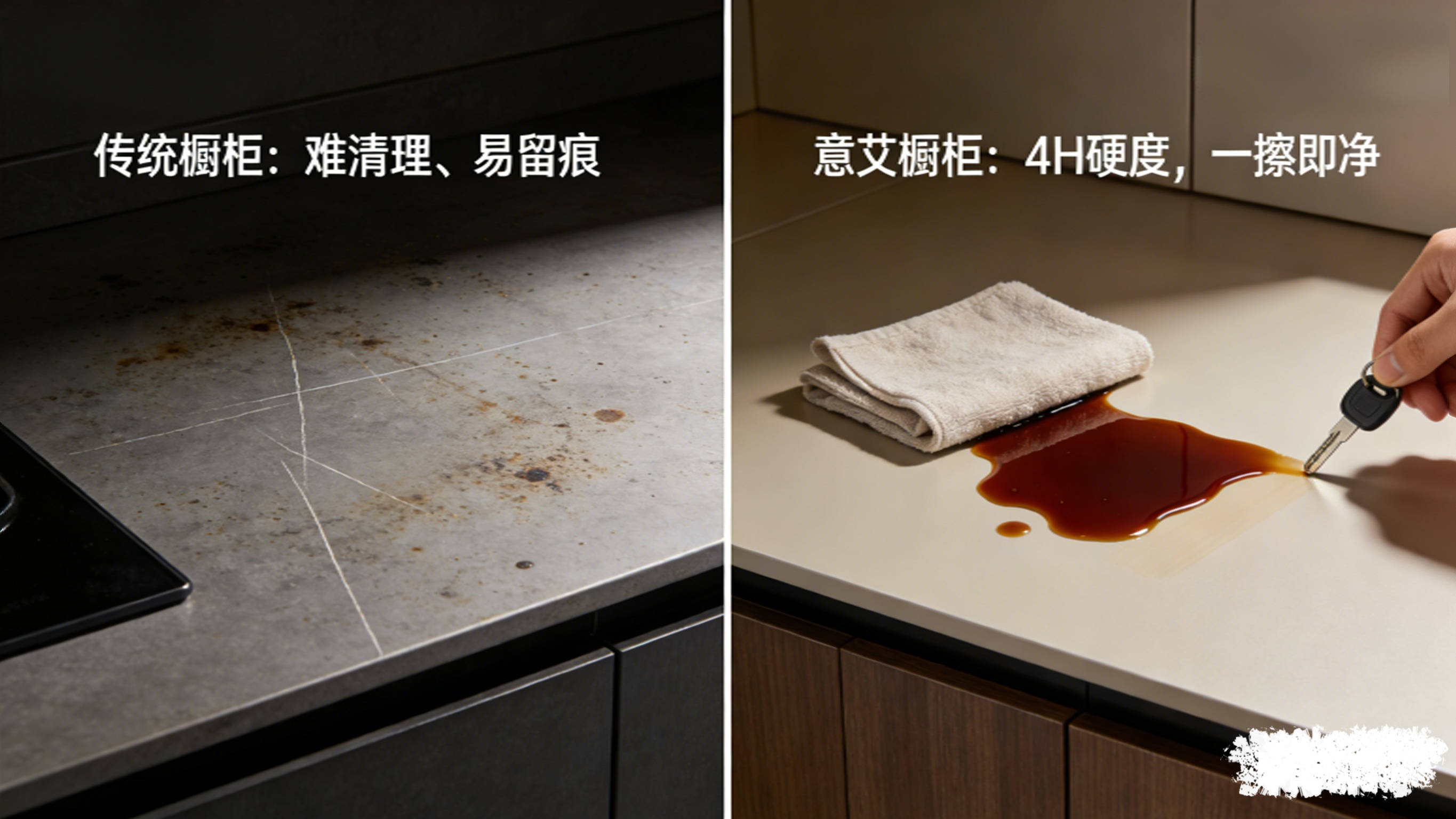 都市魅影橱柜最核心的优势,在于专为厨房高频场景设计的耐造材质,让清洁告别 “费腰模式”。