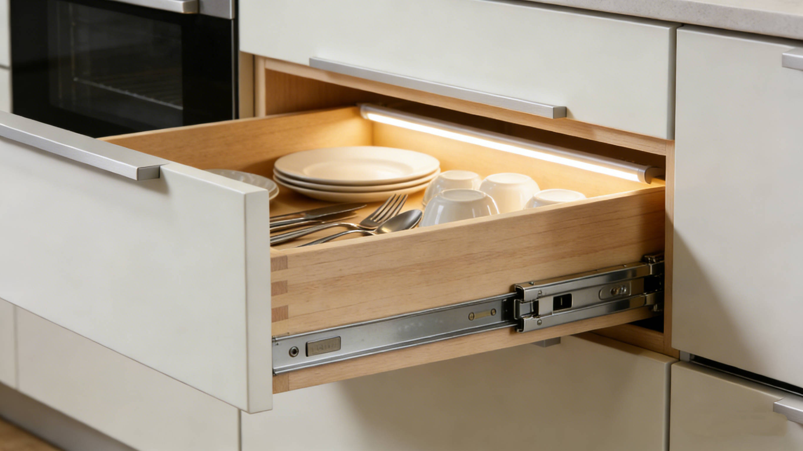 五金配件选用百隆优配系列,铰链带缓冲阻尼功能,柜门开合轻柔静音,避免夹手风险,同时承重性强、耐磨耐用,经测试可实现上万次顺畅开合不松动。柜内标配防撞胶粒,减少门板与柜体的冲击碰撞,既保护板材,又降低使用噪音,让厨房操作更显从容。