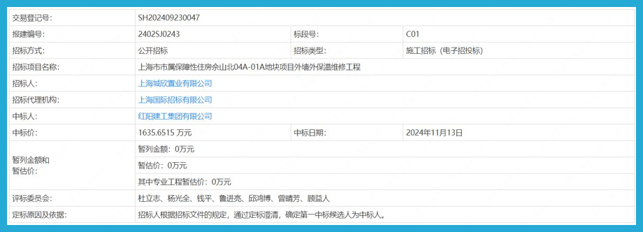 记者通过“企查查”查询到,结香苑的开发商是上海城欣置业有限公司,此次外墙维修改造的施工方是红阳建工集团有限公司。2024年11月,红阳建工集团中标了《上海市市属保障性住房佘山北04A-01A地块项目外墙外保温维修工程》,中标价格1635.6515万元。该工程的招标人是城欣置业公司。