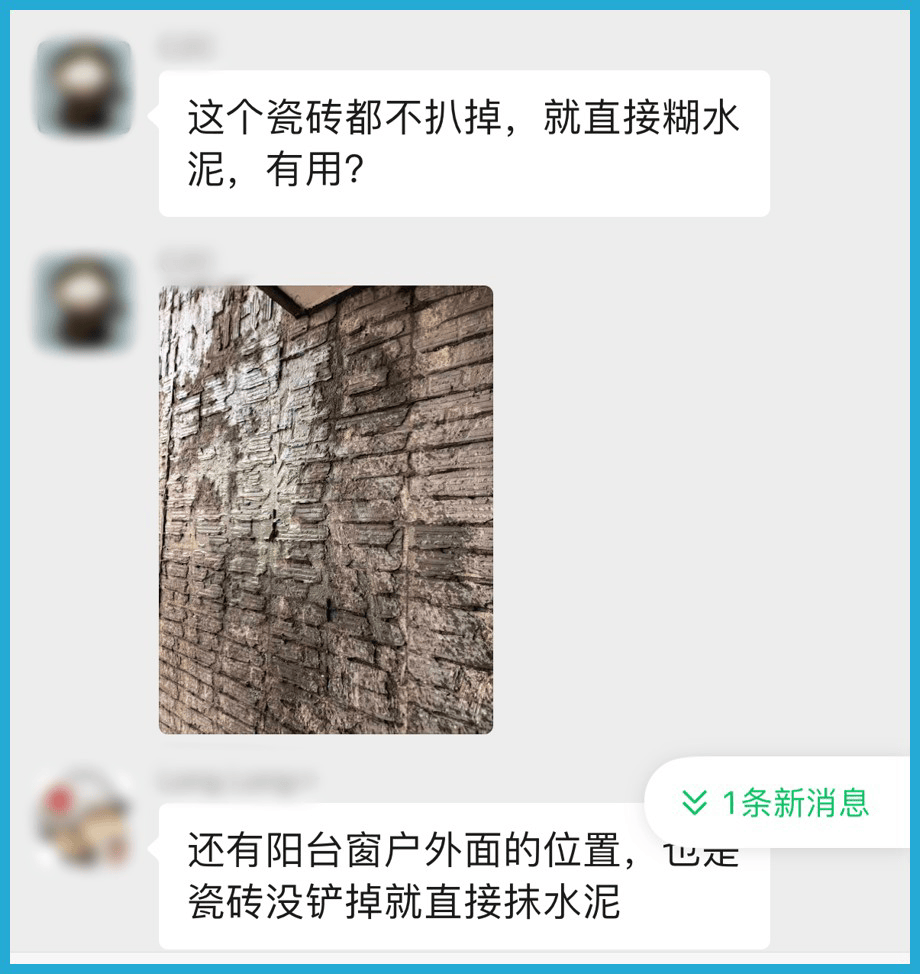 部分居民对外墙维修改造工程持排斥态度,背后亦折射出对施工单位不信任,认为其施工质量不过关,不靠谱。有人困惑:工人“瓷砖没铲掉直接糊水泥”,“瓷砖没铲掉就涂黄色隔水层”。还有人抱怨:“家里每天一层灰,一天拖地两遍。”“这个家里像在沙漠一样的。”“厨房灯都掉下来了。”甚至有居民质疑:“不是惠民工程吗,怎么搞成这副样子?”