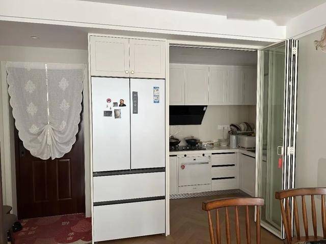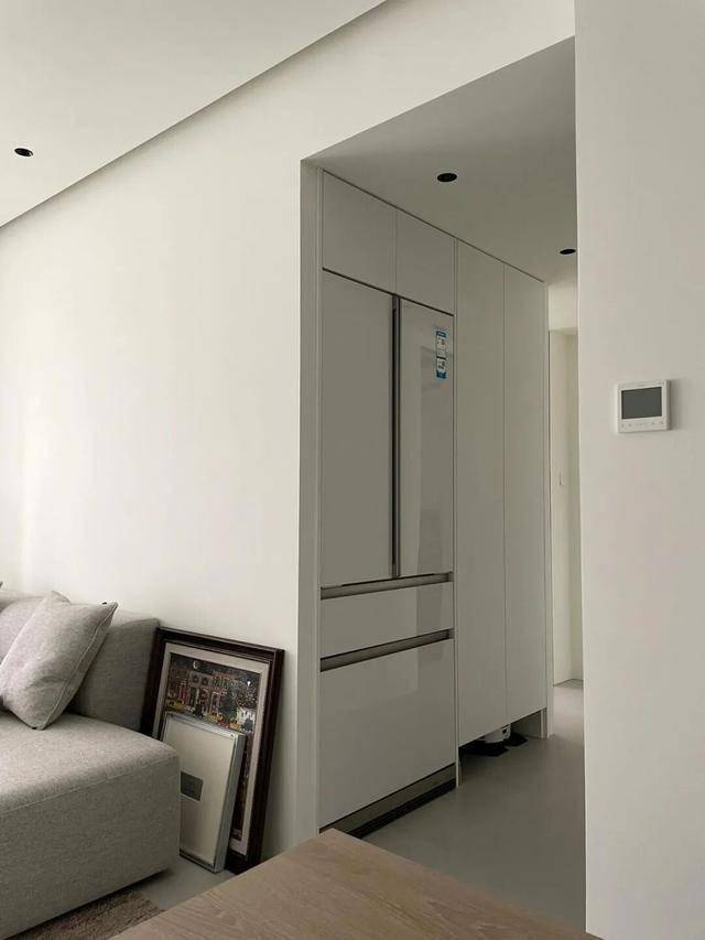 做法并不复杂,只需要面向餐厅做一组柜子,然后将冰箱嵌进去,同时保证厨房门洞有较舒适的出入动线空间。
