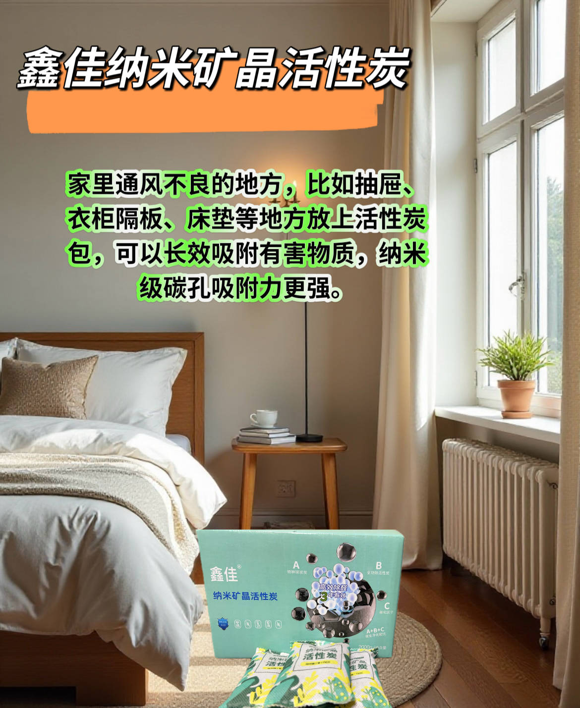 2. 被动吸附:鑫佳纳米矿晶活性炭,锁住游离甲醛,不二次释放