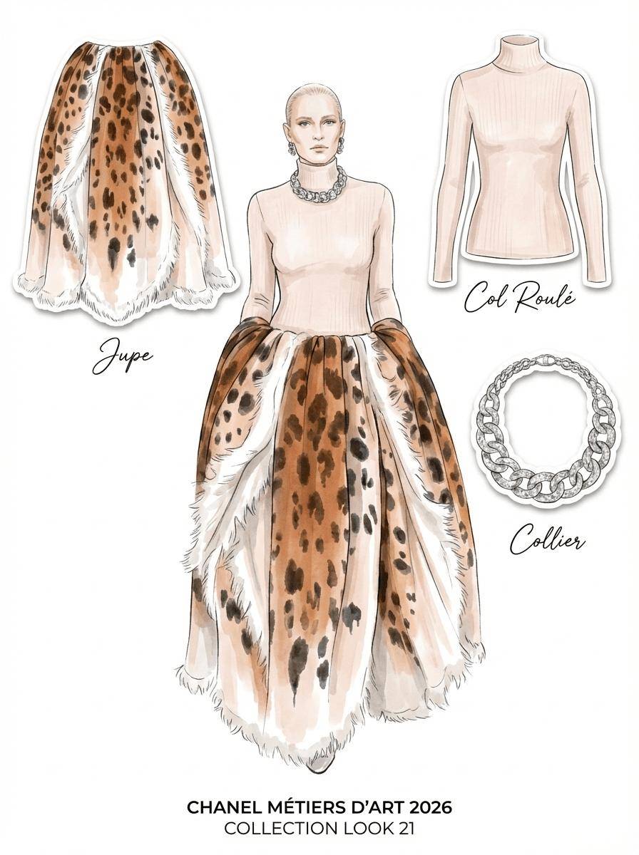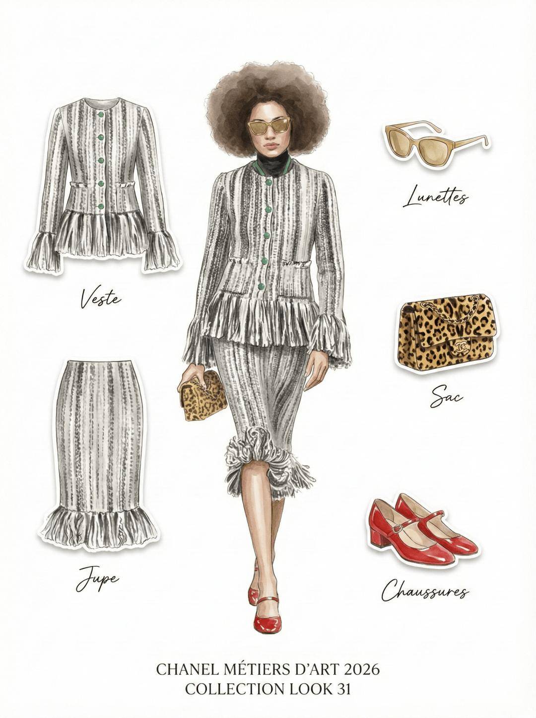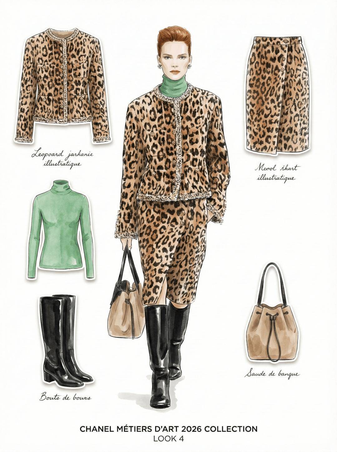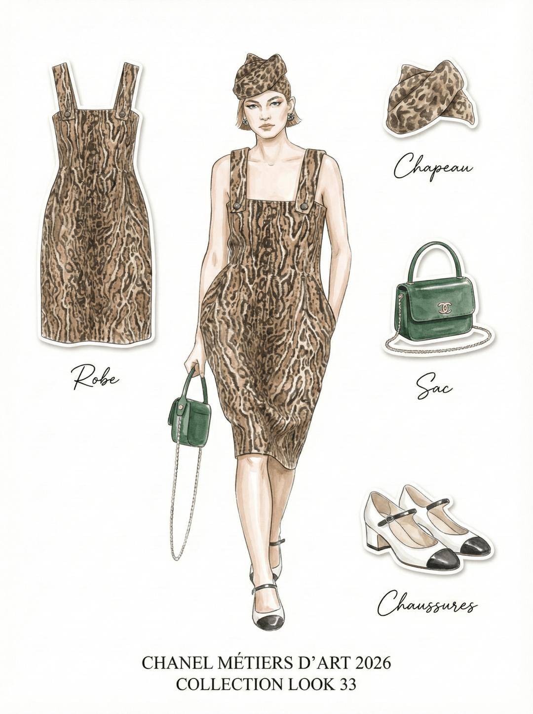 豹纹图案,对于Gabrielle Chanel来说不仅是装饰,更是一种独立宣言。不过Matthieu Blazy并非以张扬的印花形式出现,而是通过Lesage刺绣工坊的精巧工艺,让其化为提花织物上若隐若现的斑纹,或是用不同深浅的丝线编织出细腻的肌理。它被运用于经典套装上,以及阔腿裤、修身连衣裙,甚至运动风的发带之上,褪去了传统的野性象征。