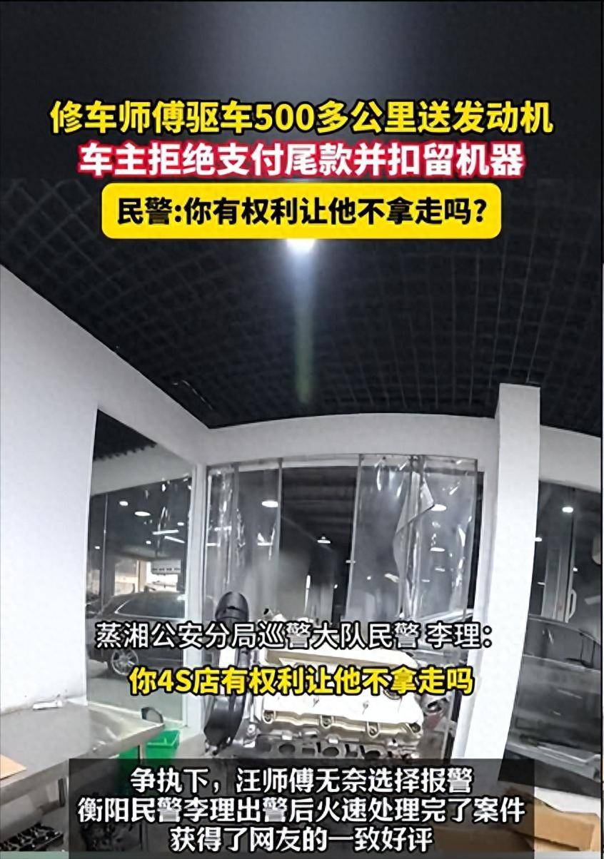 近日,湖南衡阳一位汽修师傅长途驱车500多公里,将一台发动机送至客户指定地点。然而在交货现场,客户却突然拒绝支付尾款,并阻拦师傅将机器带走。