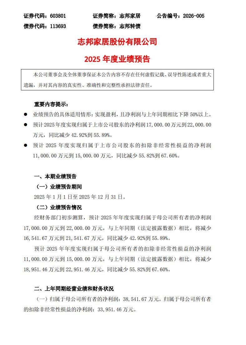 1月22日,定制家居龙头企业志邦家居(603801.SH)披露2025年度业绩预告,核心盈利指标出现显著下滑。