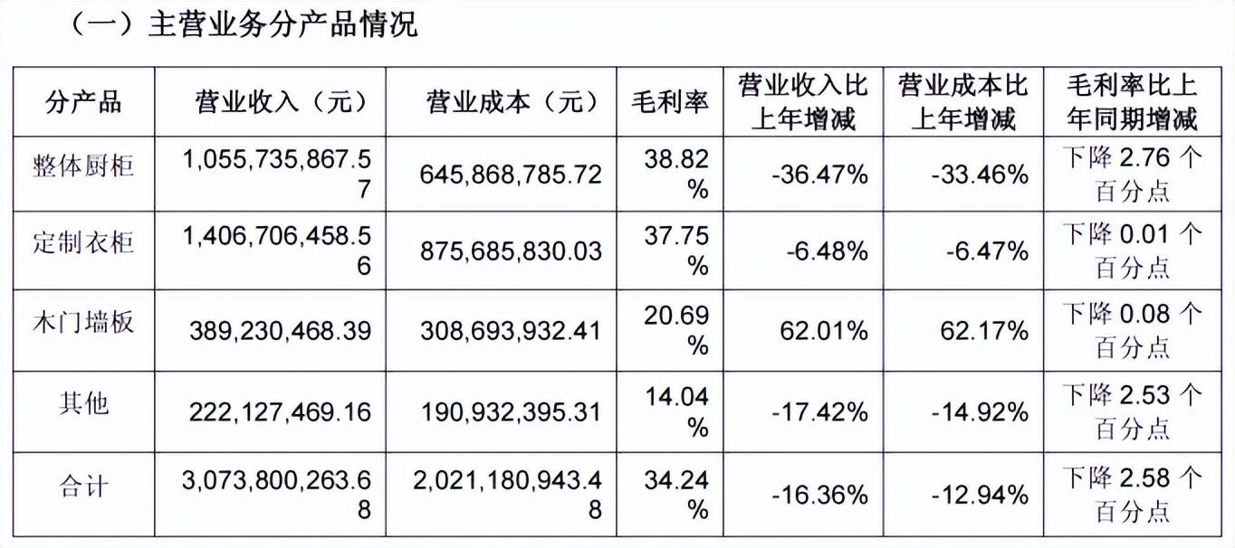 作为起家的核心品类,橱柜业务的下滑最为突出,成为拖累整体业绩的主要因素。2025年前三季度,整体橱柜业务营收同比下降36.47%,毛利率同步下滑2.76%,两项指标降幅均居各业务板块首位。值得注意的是,橱柜业务的行业地位持续弱化:2023年其营收占比首次跌破50%,2025年上半年规模被定制衣柜业务反超,退居公司第二大业务,标志着传统核心品类的增长引擎作用正式消退。