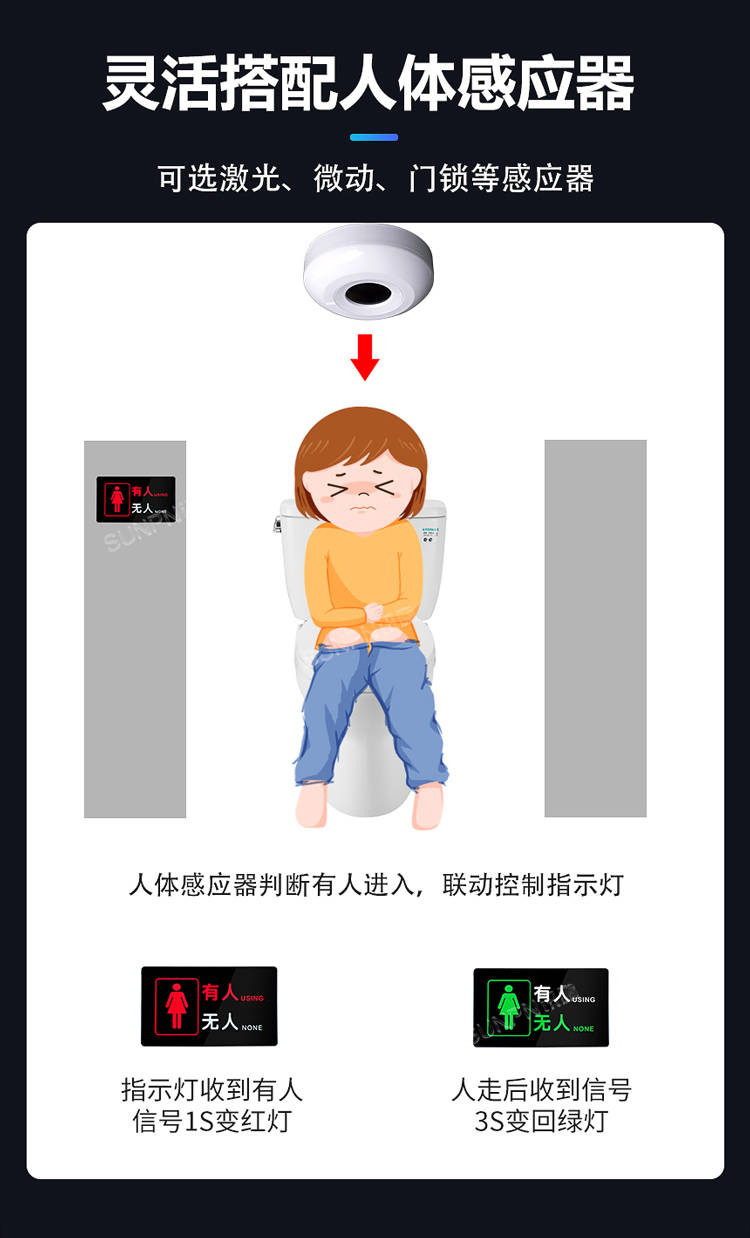智能感应联动系统是产品的大脑。通过灵活搭配激光、微动、门锁等多种人体感应器,实现精准的状态判断。当顾客进入厕位,感应器在1秒内将信号传递至门头屏,红灯即时亮起;人离开后,3秒延迟再切回绿灯,既避免误判,又预留了隐私缓冲时间。这种"秒级响应"的技术特性,解决了传统机械门锁指示延迟或不准确的根本问题。