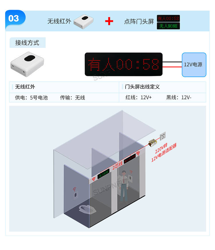 有线方案以激光人体感应器+背光门头牌为核心。感应器安装于厕位天花板(蹲坑或马桶前沿正上方),通过3芯线连接门头指示灯,12V统一供电。该方案信号稳定、响应迅速,适合新建商场或正在装修的卫生间。若需接入智慧厕所引导系统,感应器可扩展RS485或无线通讯模块,实现2芯供电、2芯信号并联,将单个厕位数据汇入中央管理平台,形成完整的如厕引导网络。