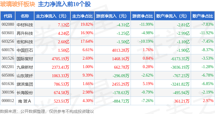 从资金流向上来看,当日玻璃玻纤板块主力资金净流入16.04亿元,游资资金净流出6.58亿元,散户资金净流出9.46亿元。玻璃玻纤板块个股资金流向见下表: