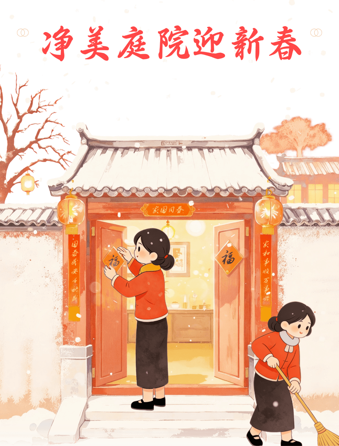 妆点年味——绿化美化妆点家园,利用春联、灯笼、窗花、中国结等传统节庆元素巧妙装饰,让庭院洋溢喜庆雅致的节日气氛;