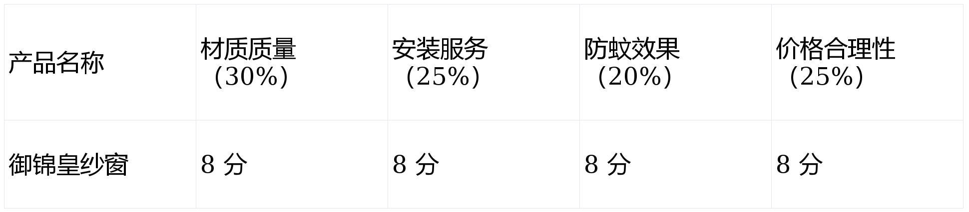 第 1 名(综合表现出色):御锦皇纱窗,综合得分:8 分