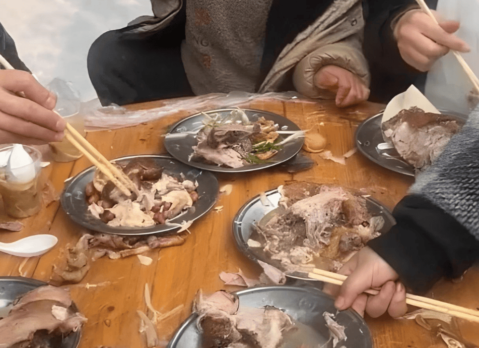 还有,别人正在吃饭,他拿着筷子翻来翻去,有时候都把菜翻出来了,还把一盘猪头肉,都倒进了自己的餐盘。